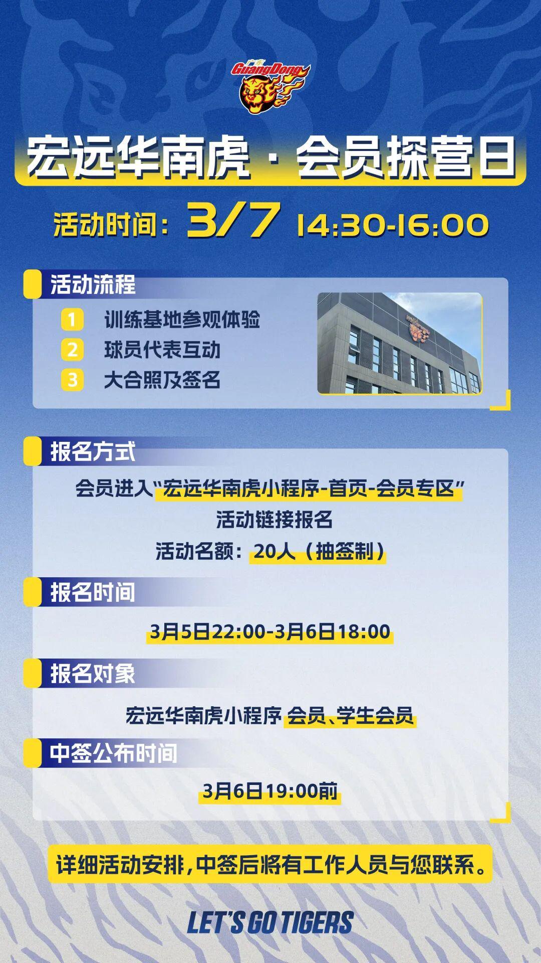 会员探营日宏远华南虎< 2026/03/07 > 来啦!3月7日(本周六),宏远华南虎首个会员探营日开启!探秘训练基地、深度体验训练日常、与球员代表面对面互动、获得独家福利! 活 动 流 程01训练基地参观体验解锁平日不对外开放的宏远训练基地!打卡力量房、训练场地,沉浸式体验备战日常。02球员代表互动活动将设置趣味互动环节,会员可与球员代表共同参...